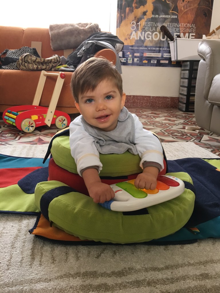 Le corset siège est un fauteuil conçu sur mesure par un appareilleur. Il permet une position assise confortable et adaptée aux besoins de l’enfant (position des jambes et du bassin, accoudoirs, appui-tête, support roulant, etc.). Marius a bénéficié de son premier corset siège à l’âge de 9 mois. Nous l’utilisons principalement à table pour les repas et les jeux.