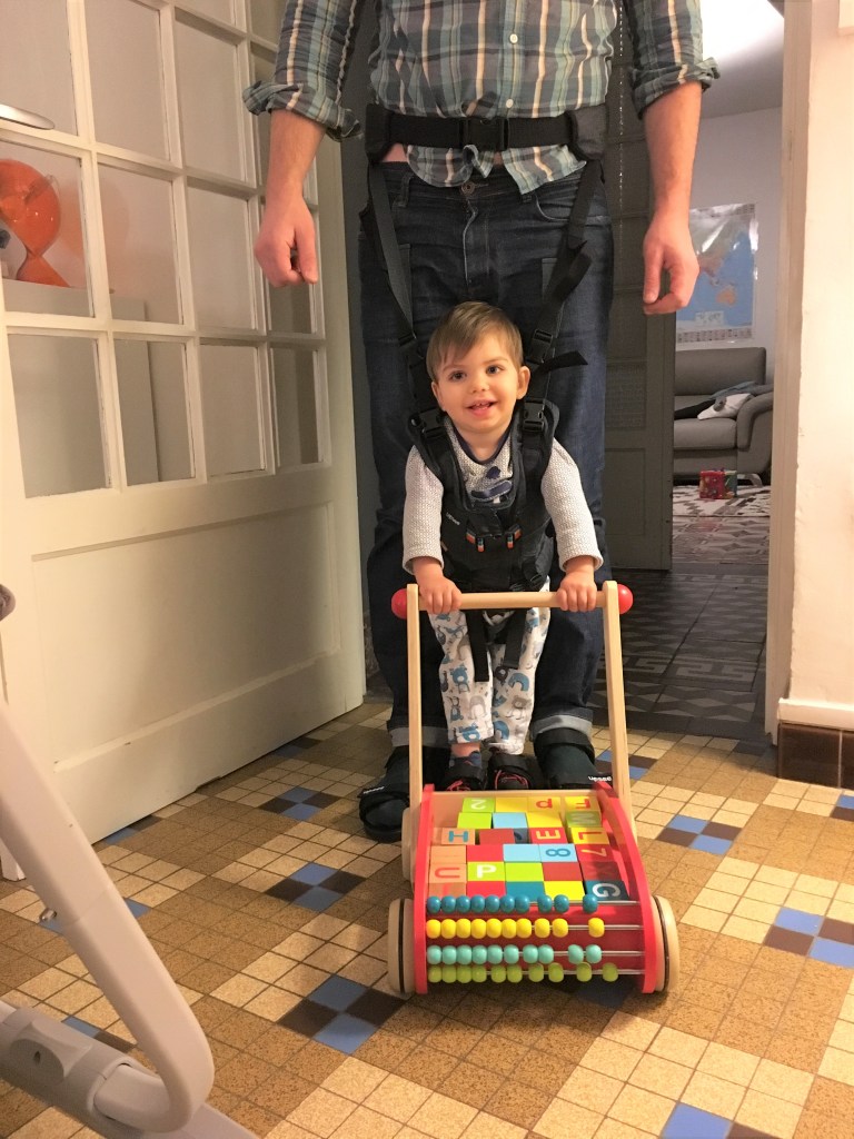 Le Upsee est un harnais qui permet à Marius de faire des activités debout et de marcher en étant soutenu par un adulte. Le harnais est attaché à la ceinture de l’accompagnant. Pour stimuler les pas (ou les coups de pieds dans le ballon!), on peut utiliser les sandales doubles. Nous utilisons le Upsee principalement pour les activités et jeux à l’extérieur. Grâce à cet équipement, Marius apprend à maintenir son poids sur ses jambes et ses pieds, et à initier des pas en pliant bien les genoux.