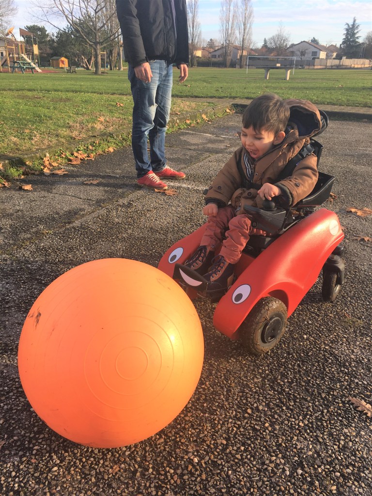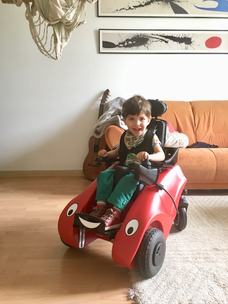 Depuis juin 2019, Marius utilise un petit fauteuil roulant électrique, le Wizzybug, pour se déplacer tout seul à la maison et à l’extérieur. Petit à petit, il acquiert une meilleure maitrise des mouvements de sa main pour utiliser le joystick qui sert à se diriger. Les bienfaits de l’utilisation d’un fauteuil électrique pour les jeunes enfants sont nombreux: sentiment d’indépendance, exploration volontaire, orientation dans l’espace, renforcement de l’estime de soi, inclusion… Le Wizzybug offre de nouvelles perspectives d’aventure!