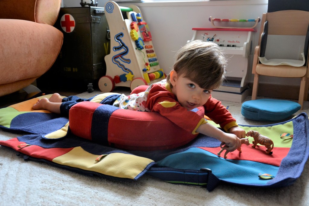 Le playpak est une valise nomade contenant plusieurs éléments à scratcher. Il permet de proposer différentes positions à Marius afin de stimuler son maintien de buste et de tête: assis, sur le ventre, à quatre pattes, etc. Ce système lui permet de jouer au sol avec ses copains, qui aiment aussi s’y installer!