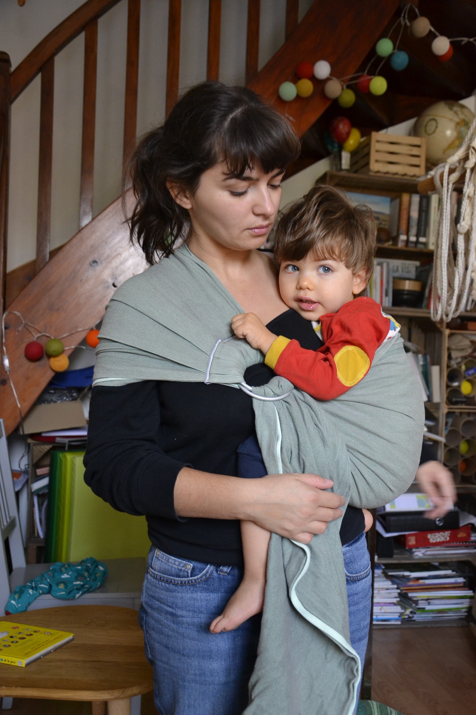 - Portage sur la hanche avec une écharpe Sling, que nous utilisons depuis sa naissance. Le portage sur la hanche permet à Marius de se tenir à califourchon et de bien voir, et libère les bras du porteur. Il devient trop grand pour ce type de portage, que nous n’utilisons plus que sur de très courtes distances.