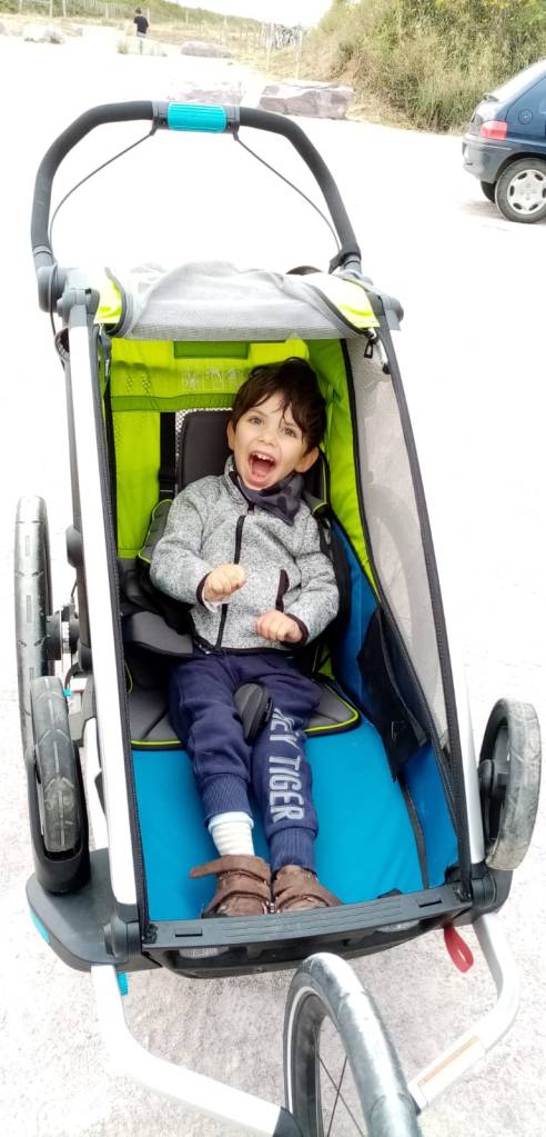 Nous avons récemment investi (c’est le mot!) dans un Chariot Thule Sport, une remorque vélo qui fait aussi poussette classique ou de jogging, randonnée et même ski de fond!! Cette remorque nous permet d’envisager plein de nouvelles activités. Premiers essais lors des vacances en Bretagne à l’été 2020, on l’emmène aussi sur la plage! On aime son côté multifonction et sa robustesse, en revanche elle est assez lourde et volumineuse. On espère que Marius pourra en profiter de nombreuses années…